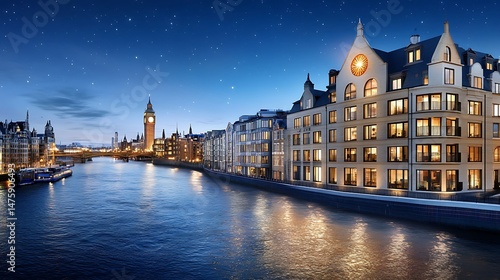 © Kobkaew, Fototapeta premium Evening urban skyline view from a car london panoramic image serene river environment
