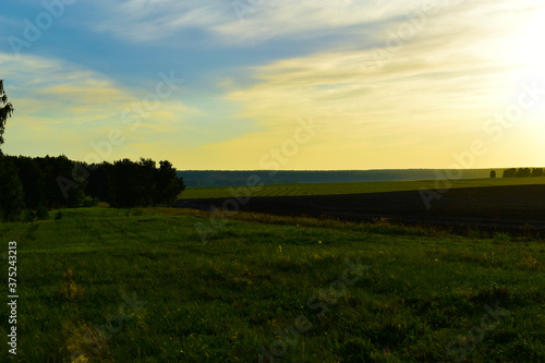© Lushchikov Valeriy, Obraz premium Evening view of a rural field with a beautiful yellow sky