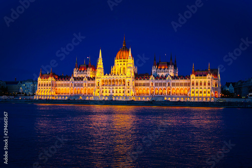 Naklejka premium Evening View of Budapest Parliament at sunset, Hungary. Wonderful Cityscape...