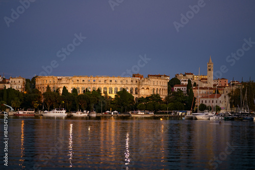 © Alexander, Fototapeta premium Evening view of Pula with the illuminated Roman Amphitheatre, calm marina, boats and reflections on the Adriatic Sea. Scenic coastal cityscape of Croatia.