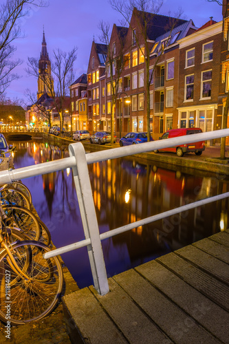 Fototapeta premium Evening view of the canal and the church in Delft. Dutch city in the spring after sunset. Holland, Netherlands.