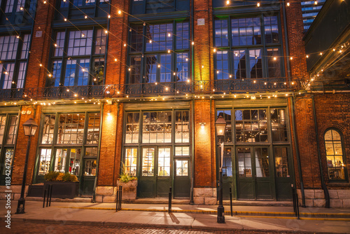 Fototapeta premium Evening view of the historic Distillery District in Toronto with illuminated brick architecture, tall windows, and festive string lights.