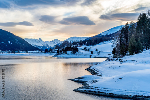 Obraz premium Evening winter scenery of Davos Lake, Switzerland.