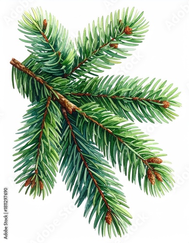 © denaa, Fototapeta premium Evergreen branch with tiny cones on white background