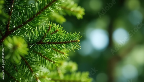 © Patcharin, Fototapeta premium Evergreen branches reaching out, with fresh green needles and a soft bokeh background for a nature scene