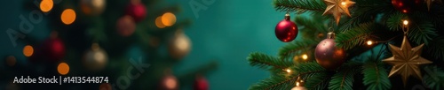 © Kachaphot, Naklejka premium Evergreen Christmas tree with multicolored lights and ornaments against a bright background, colorful lights, festive scene