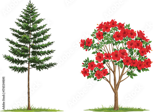 © Ashikur, Fototapeta premium Evergreen Conifer Tree and Red Flowering Shrub Botanical Vector Illustration with Green Grass, Nature Contrast, Seasonal Tree Comparison for Stock Use