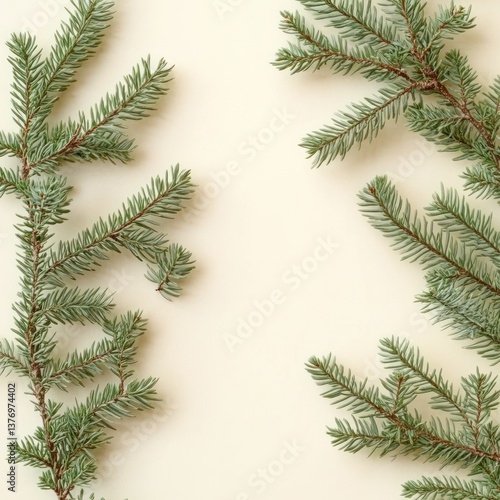 © Milana, Obraz premium Evergreen Fir Branches on Pastel Beige Background Minimalist Flat Lay