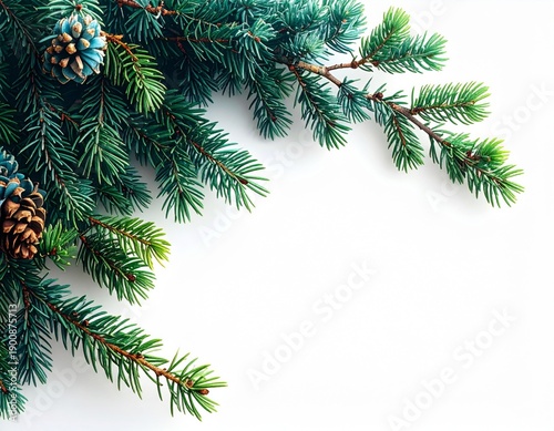 Obraz premium Evergreen Fir Tree Branches with Pinecones on White Background Holiday Still...