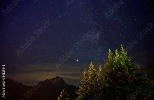 Naklejka premium Evergreen fir tree with cones, peaks of French Alps mountains and starry sky...
