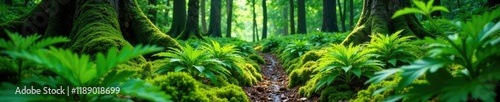 Fototapeta premium Evergreen forest floor covered with ferns and moss, plant life, nature, greenery