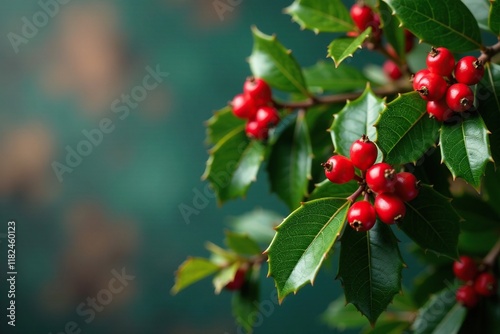 Obraz premium Evergreen holly branches with bright red berries, festive decor, red berries,...