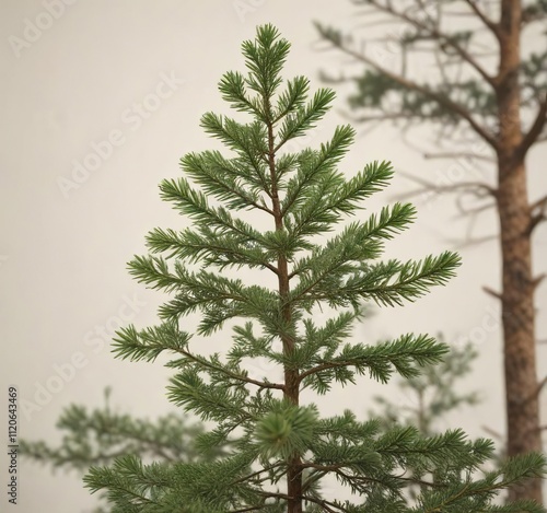 © Kingphet, Obraz premium Evergreen pine tree with full branches and needle-like foliage against a warm white background, evergreen tree, branchy tree