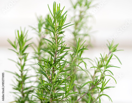 © Zhanna, Fototapeta premium Evergreen rosemary plant growing in a garden, in a pot.