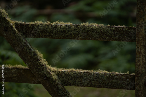 © badescu, Fototapeta premium Evernia prunastri grown on a wooden fence. Oak lichen covering the wooden planks