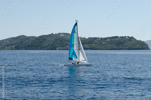 © caocao191, Naklejka premium Evia island, Greece - June 28. 2020: Sailing boat on the move on the high seas