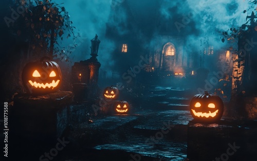 Fototapeta premium Evil atmosphere in a graveyard at night, jack o lantern pumpkins glowing, mist surrounding a haunted house or castle, perfect for spooky season