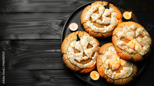 Fototapeta premium Evil Faced Halloween Pumpkin Cookies with Candles on Black Wooden Table copy space