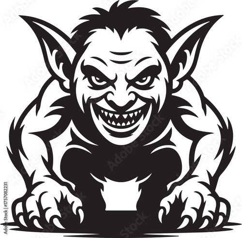 © stockingtimee, Obraz premium Evil Goblin Silhouette with Sharp Teeth and Pointed Ears