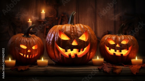 Obraz premium Evil Halloween pumpkins with scary faces and burning candles on wooden table