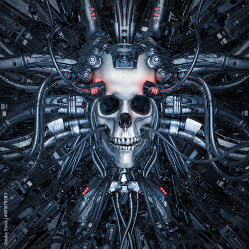 © grandeduc, Fototapeta premium Evil in the machine - 3D illustration of science fiction cyberpunk human skull connected to computer core