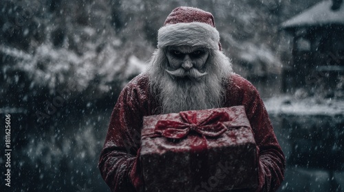 Fototapeta premium Evil santa character stands outdoors with a red Christmas gift. Scary Santa Claus concept for festive horror and dark holiday themes.