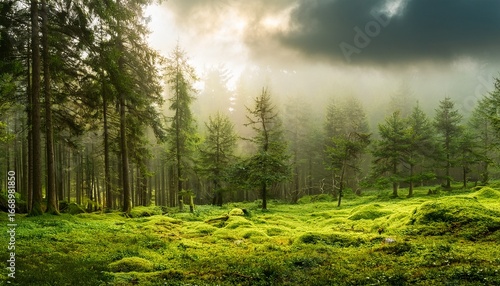 Fototapeta premium evocative forrest landscape featuring lush trees and vibrant grass