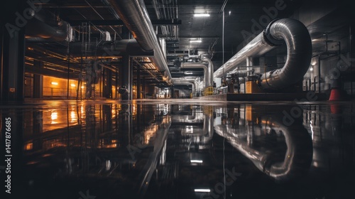 Obraz premium Evocative industrial interior reflecting complex pipeline architecture inside a dark factory offering a captivating interplay of light and reflections