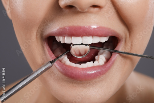 Obraz premium Examining woman's teeth with dentist's mirror on grey background, closeup