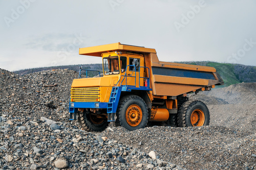 © Letopisec, Obraz premium Excavation work in a mountainous wooded area. A dump truck during a pause.