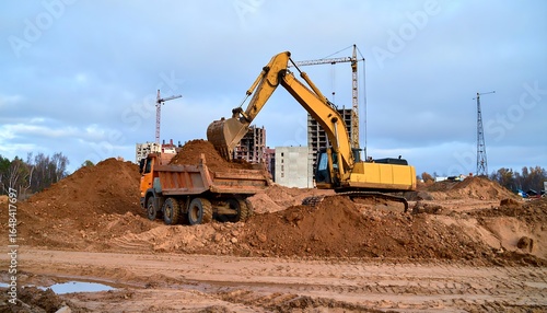Fototapeta premium Excavator loading a truck with dirt on a construction site