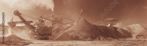 © esalienko, Obraz premium Excavator on the background of stone-crushing equipment at the limestone quarry, monochrome panoramic image of a light brown color, sepia. Mining industry.