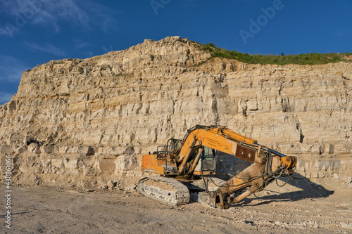 © Igor Syrbu, Obraz premium Excavator stands on the background of a stone quarry.