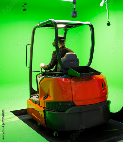 Fototapeta premium Excavator virtual simulation training. Man control excavator using VR system.