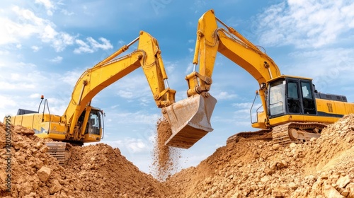 Obraz premium Excavators digging soil, construction site, sunny day, industry