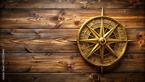 Fototapeta premium Excellent Golden Vintage Compass Rose on a Rustic Wooden Plank Background with Ample Copy Space for Travel Themes, Adventure Projects, and Nautical Designs