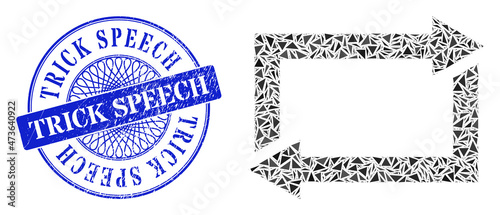 Fototapeta premium Exchange arrows mosaic of triangle, and Trick Speech rubber seal print. Blue stamp seal includes Trick Speech tag inside circle form. Vector exchange arrows mosaic is done of random triangle parts.