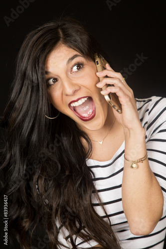 Fototapeta premium Excited beautiful brunette woman talking on her cell phone