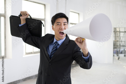 Fototapeta premium Excited businessman cheering through a megaphone