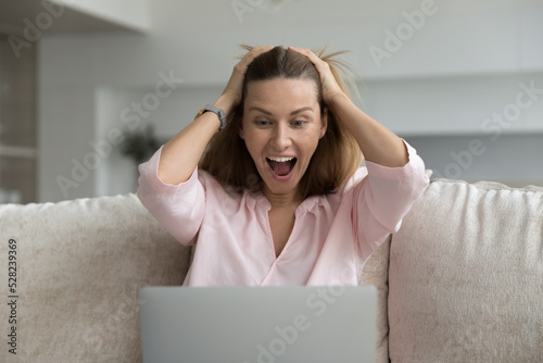 Fototapeta premium Excited cheerful pretty 30s laptop user woman staring at display, shouting for joy, gasping, laughing, holding head in amazement, surprise, getting good awesome news, sitting on home couch