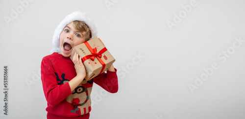 Obraz premium Excited funny Canadian caucasian child girl boy wear red Santa hat holding...