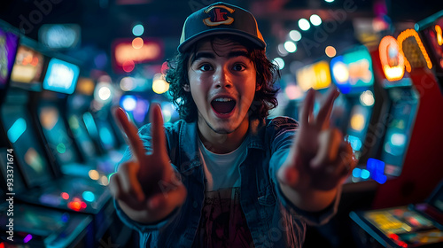 © Siasart Stock, Obraz premium Excited gamer making peace sign at arcade.