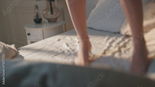 Fototapeta premium Excited legs jumping bed in morning sunlight closeup. Happy slim woman dancing
