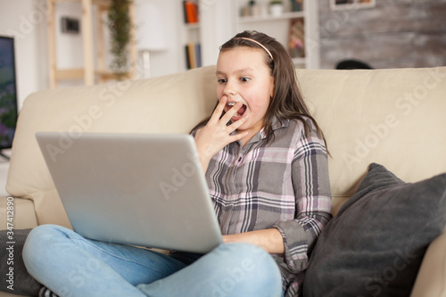 Fototapeta premium Excited little girl with braces while using her laptop sitting on the couch...
