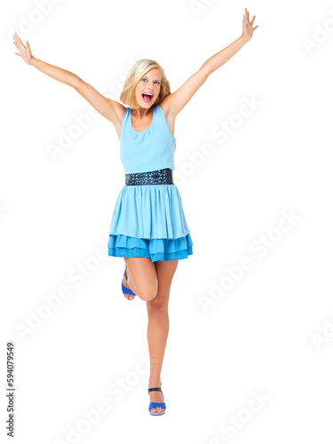 Fototapeta premium Excited, surprise and energy with portrait of woman with celebration, motivation and success. Freedom, wow and smile of a model girl with confidence and isolated on a transparent, png background