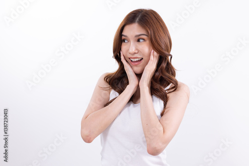 © Washburn, Fototapeta premium Excited woman expressing surprise with hands on face