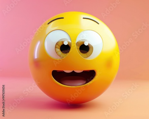 Fototapeta premium Excited yellow emoji with wide eyes and open mouth, thrilled, 3D stylized, vibrant.