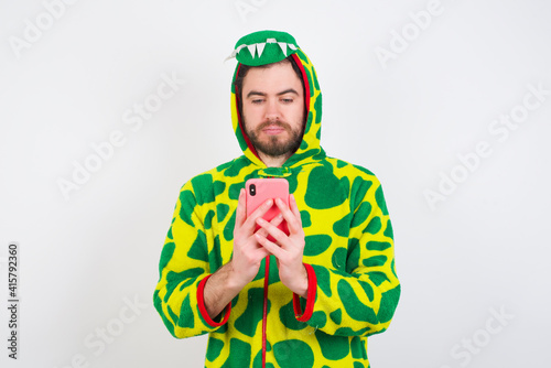© Jihan, Fototapeta premium Excited young caucasian man wearing a pajama standing against white background winking and eye hold smart phone use read social network news