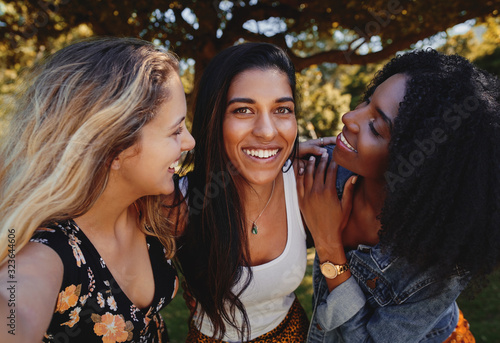 Obraz premium Excited young group of women posing between female charming friends in trendy clothes taking selfie - young girls taking a selfie in a park on a sunny day