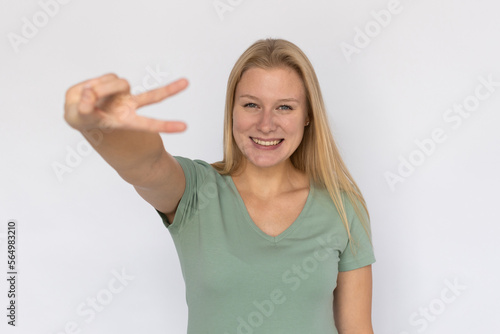 © Mangostar, Fototapeta premium Excited young woman showing victory gesture. Portrait of happy Caucasian female model with fair hair in green T-shirt looking at camera, smiling and greeting someone. Success, optimism concept